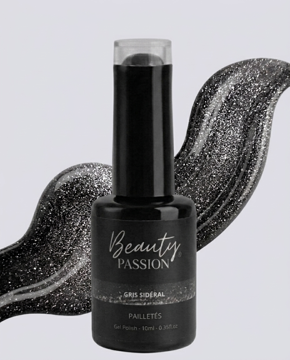 Osez notre Gris Sidéral, un vernis semi-permanent gris profond sublimé d’éclats argentés pour une manucure chic, moderne et lumineuse.
