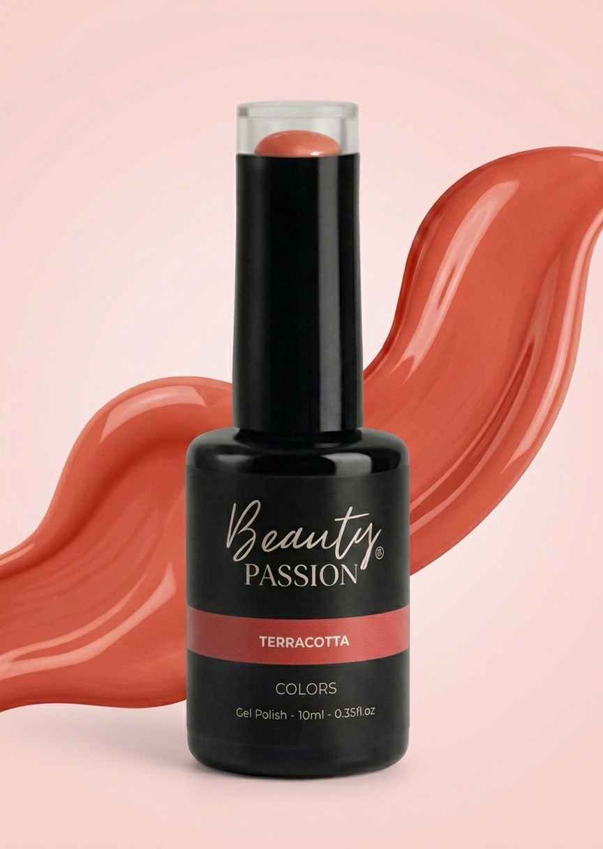 Terracotta de Beauty Passion est un vernis semi-permanent aux tons chauds et terreux, mêlant orange et brun pour un look naturel, élégant et moderne.