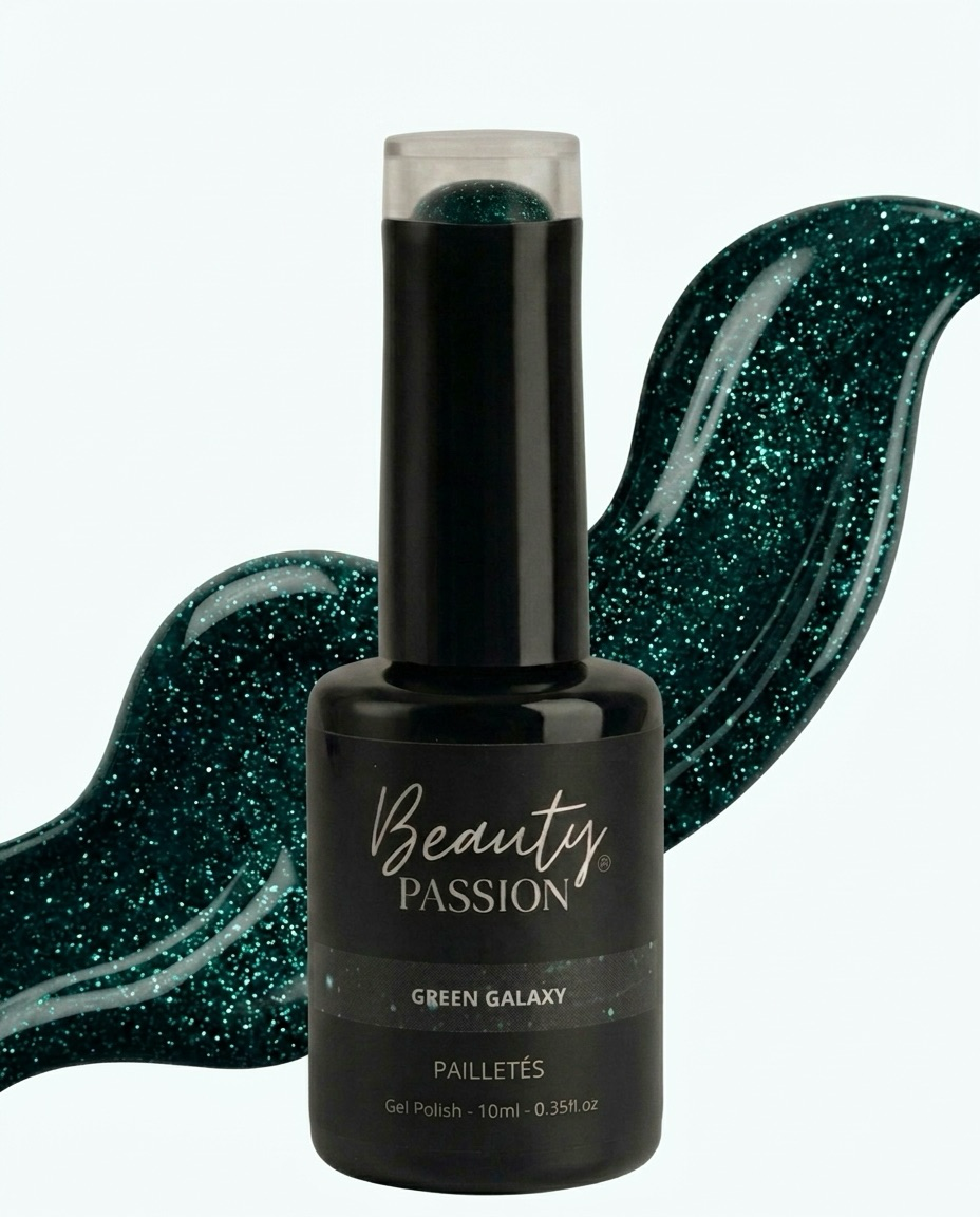 Découvrez la couleur 61-Green Galaxy de Beauty Passion , un vert pailleté intense et profond pour une manucure tendance à chaque saison.