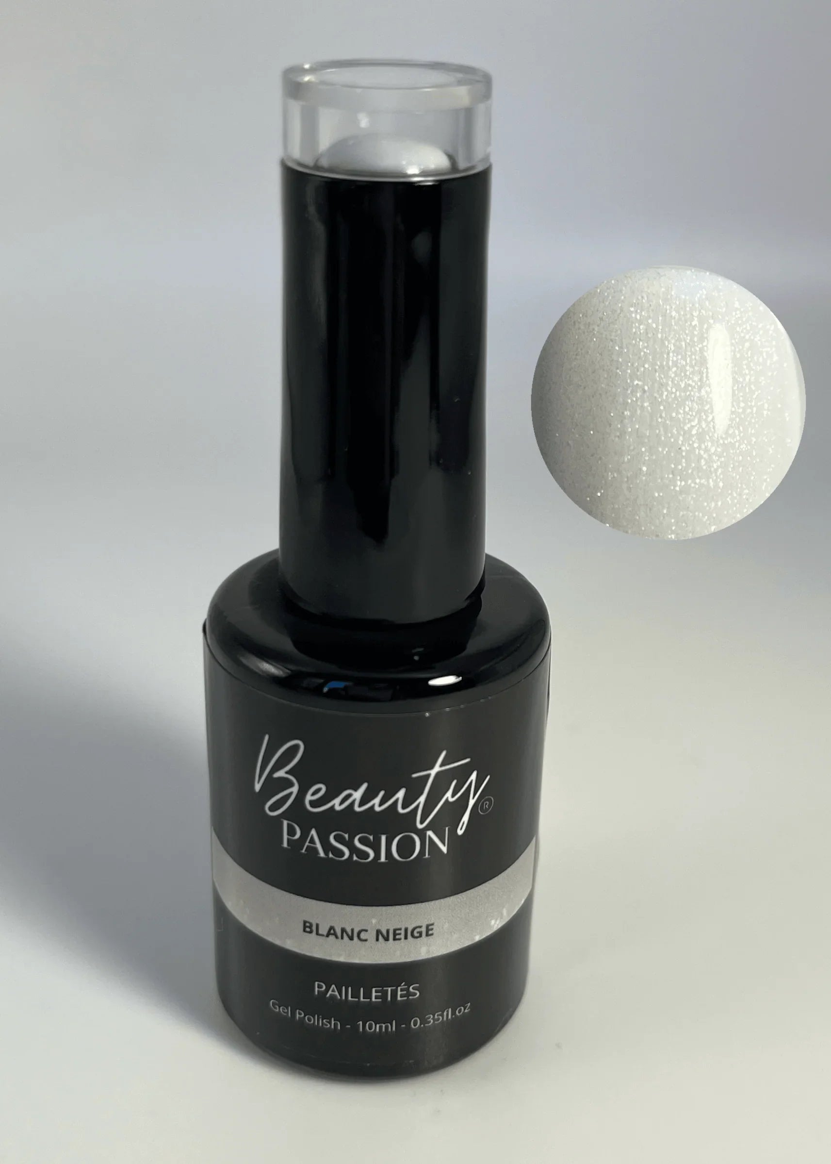Blanc Neige de Beauty Passion est un vernis semi-permanent blanc scintillant, sublimé de mini paillettes qui rappellent l’éclat délicat de la neige. Une teinte lumineuse, parfaite pour la fin d’année et la saison hivernale, idéale pour des manucures douces, festives et raffinées.